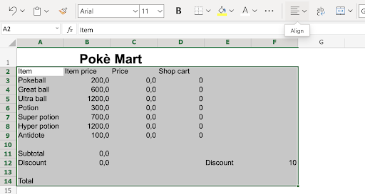 A2:F14 - Click the Align button in the Ribbon