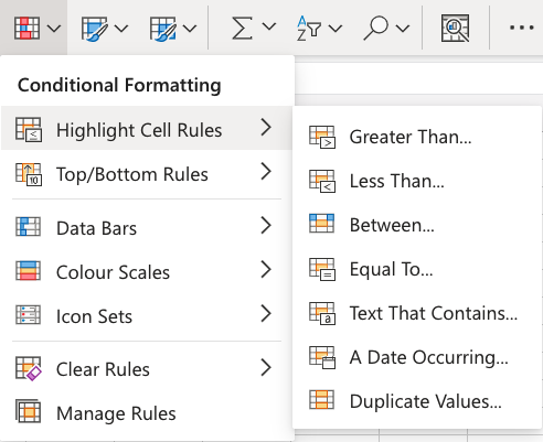 Here is the Highlight Cell Rules part of the conditional formatting menu: