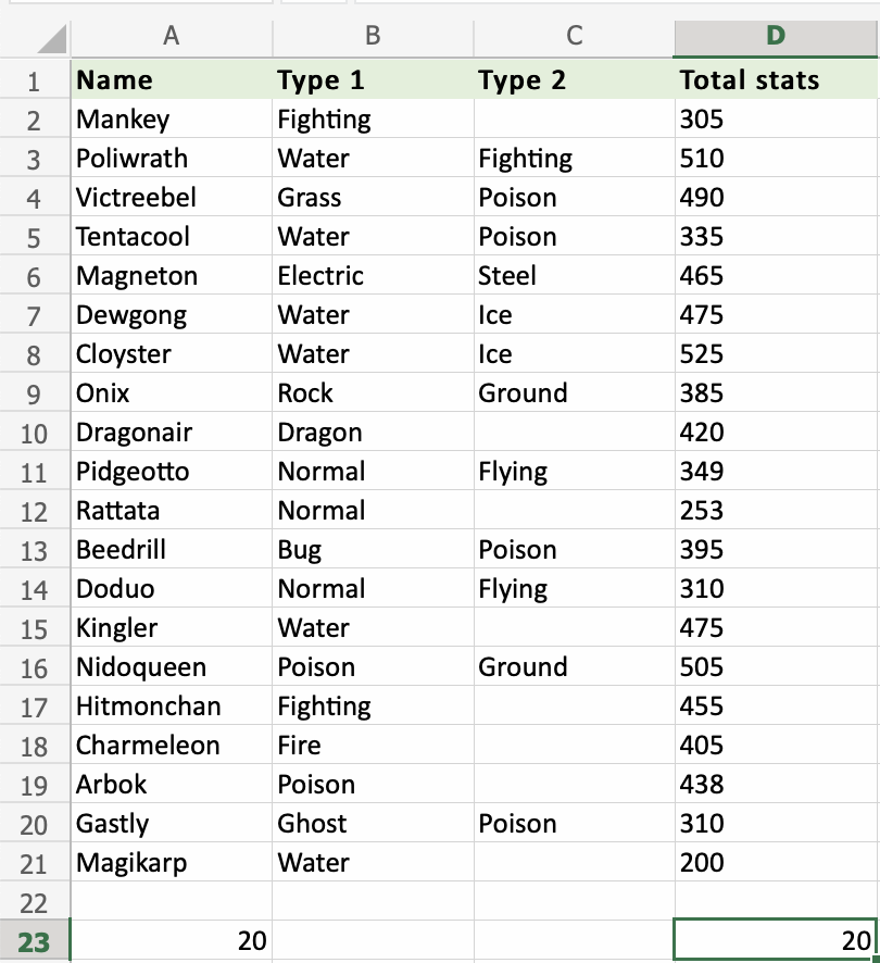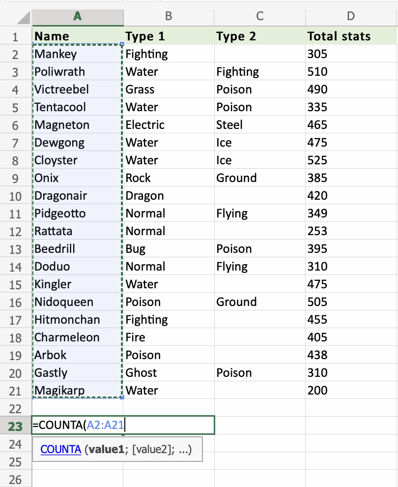 Apply the =COUNTA function to range A2:A21, counting Pokemons by their names, which are letters only: