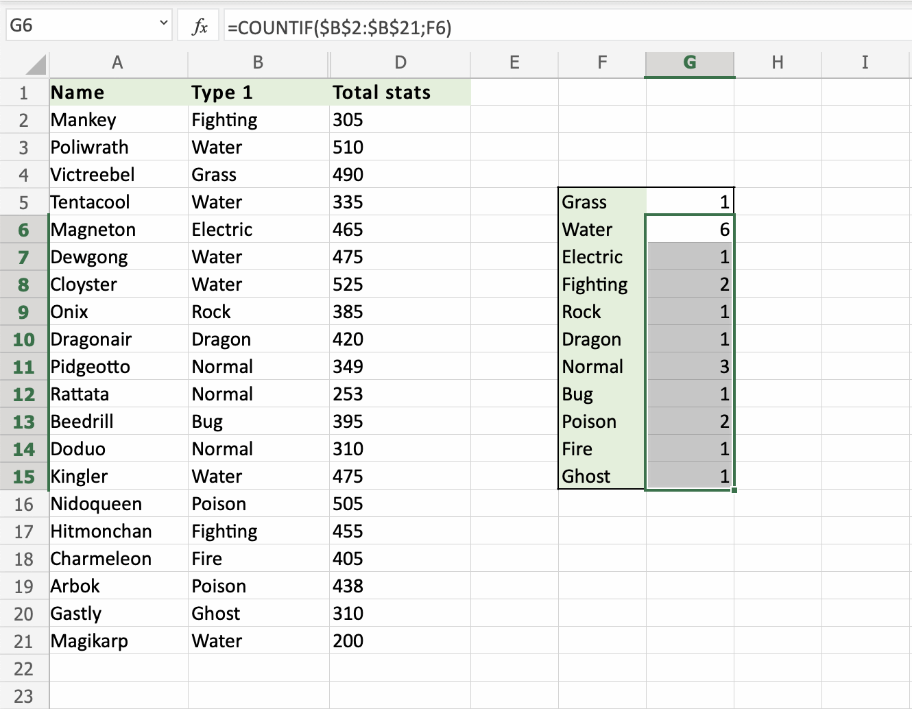 Apply the COUNTIF function to range B2:B21, to count how many Pokemons we have in the different types: