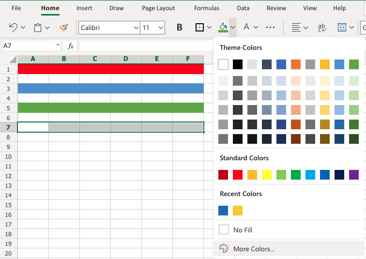 Excel has a set of themes and standard colors available for use. You select a color by clicking it: