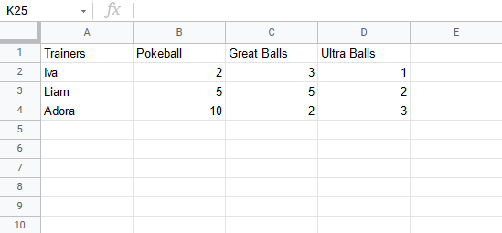 Note: It is important to practice reading data to understand its context. In this example you should focus on the trainers and their Pokeballs, which have three different types: Pokeball, Great ball and Ultra ball.