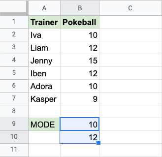 It returns the number 10 in the first cell (B9) and the number 12 in the second cell (B10). Both 10 and 12 are seen twice, which is more than any of the other values.