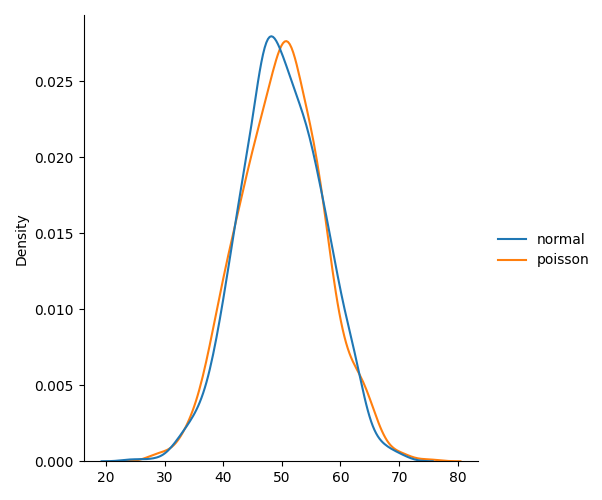 from numpy import random import matplotlib.pyplot as plt import seaborn as sns data = { "normal": random.normal(loc=50, scale=7, size=1000), "poisson": random.poisson(lam=50, size=1000) } sns.displot(data, kind="kde") plt.show()