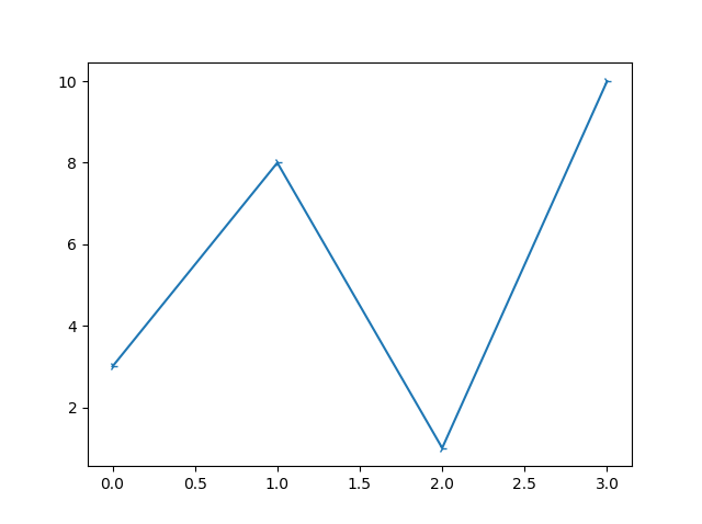 #Three lines to make our compiler able to draw: import sys import matplotlib matplotlib.use('Agg') import matplotlib.pyplot as plt import numpy as np ypoints = np.array([3, 8, 1, 10]) plt.plot(ypoints, marker = '4') plt.show() #Two lines to make our compiler able to draw: plt.savefig(sys.stdout.buffer) sys.stdout.flush()